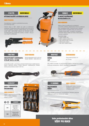SADA 7 %u00daDEROV%u00ddCH %u0160RO UBOV%u00c1K%u016e00012430017Sada 7 %u00faderov%u00fdch %u0161roubov%u00e1k%u016f1241 a 1242, v kartonuModel 1243/D71243/D712411x5,5x100-1, 2x6,5x125-1, 1x8x150-1, 6x10x200 mm1242PH1x4,5x100, PH2x6x100, PH3x8x150 mm1243/D7OBOUSTRANN%u00dd SAMONASTAVITELN%u00dd KL%u00cd%u010c, 8%u201332 MM00001860008Samonastaviteln%u00fd kl%u00ed%u010d, 8%u201332 mm Model 186/260 %u2013 d%u00e9lka 260 mm186/260Univerz%u00e1ln%u00ed pou%u017eit%u00ed %u2013 pro %u0161rouby s hlavami %u010dty%u0159hrann%u00fdmi, %u0161estihrann%u00fdmi, Spline, v%u00e1lcov%u00fdmi (imbus, Torx%u00ae), dokonce i po%u0161kozen%u00fdmi. Dvojice %u010delist%u00ed pokr%u00fdv%u00e1 %u0161irok%u00fd rozsah 8%u201332 mm.R%u00c1%u010cNA 1/4%u201d00009000882Obousm%u011brn%u00e1 r%u00e1%u010dna 1/4%u201dse 72 zuby900/55ZD%u00edky st%u00e1l%u00e9mu kontaktu 15 zub%u016f doch%u00e1z%u00ed k lep%u0161mu rozlo%u017een%u00ed sil a zv%u00fd%u0161en%u00ed %u017eivotnosti mechanismu. %u00dahel 5%u00b0 umo%u017e%u0148uje rychlej%u0161%u00ed pr%u00e1ci.Nov%u00e9 rukojeti s pru%u017einov%u00fdm mechanismem. Rukojeti vybaven%u00e9 p%u0159%u00eddavn%u00fdm ost%u0159%u00edm pro odizolov%u00e1n%u00ed vodi%u010d%u016f.MULTIFUNK%u010cN%u00cd N%u016e%u017dKY00011300002Multifunk%u010dn%u00ed n%u016f%u017eky s rovn%u00fdmi %u010depelemi s mikroozuben%u00edm z nerezov%u00e9 oceli1130BMXN%u00ddTOVAC%u00cd KLE%u0160T%u011a S OTO%u010cNOU HLAVOU00017410410Sou%u010d%u00e1st%u00ed jsou 4 snadno vym%u011bniteln%u00e9 koncovky pro r%u016fzn%u00e9 typy n%u00fdt%u016f.1741TROto%u010dn%u00e1 hlava o 360%u00b0, ide%u00e1ln%u00ed pro pr%u00e1ci ve st%u00edsn%u011bn%u00fdch prostorech. V%u00fdm%u011bnn%u00e9 koncovky o pr%u016fm%u011bru od 2,4 mm do 4,8 mm jsou prakticky uchyceny na t%u011ble n%u00e1stroje, co%u017e umo%u017e%u0148uje rychl%u00fd v%u00fdb%u011br nejvhodn%u011bj%u0161%u00ed velikosti pro konkr%u00e9tn%u00ed pou%u017eit%u00ed. Sou%u010d%u00e1st%u00ed balen%u00ed je mont%u00e1%u017en%u00ed kl%u00ed%u010d ulo%u017een%u00fd v rukojeti %u2013 v%u017edy po ruce, kdy%u017e ho pot%u0159ebujete.TLAKOV%u00dd POST%u0158IKOVA%u010c NA KOLE%u010cK%u00c1CH, 25 L1898/C0001898094025litrov%u00fd tlakov%u00fd post%u0159ikova%u010d na kole%u010dk%u00e1ch: univerz%u00e1ln%u00ed, praktick%u00fd, p%u0159izp%u016fsoben%u00fd r%u016fzn%u00fdm pot%u0159eb%u00e1m! D%u00edky nenas%u00e1kav%u00e9 hadici, nerezov%u00e9 trysce, ukazateli napln%u011bn%u00ed n%u00e1dr%u017ee a regul%u00e1toru tlaku pro dv%u011b funkce %u2013 post%u0159ik a tvorbu p%u011bny %u2013 se jedn%u00e1 o mimo%u0159%u00e1dn%u011b univerz%u00e1ln%u00ed n%u00e1stroj, ide%u00e1ln%u00ed pro %u0161irokou %u0161k%u00e1lu aplikac%u00ed v r%u016fzn%u00fdch odv%u011btv%u00edch.Technick%u00e9 %u00fadaje:%u2022 Objem n%u00e1dr%u017ee: 25 l%u2022 D%u00e9lka nap%u00e1jec%u00ed hadice: 5 m%u2022 Max. pracovn%u00ed tlak: 4%u20135 bar%u016f%u2022 D%u00e9lka trysky: 0,65 m%u2022 Max. tlak v n%u00e1dr%u017ei: 8 bar%u016fVa%u0161e profesion%u00e1ln%u00ed d%u00edlna V%u017dDY PO RUCENOVINKA! NOVINKA!10