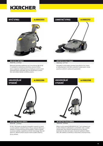 MYC%u00cd STROJUNIVERZ%u00c1LN%u00cd VYSAVA%u010cZAMETAC%u00cd STROJUNIVERZ%u00c1LN%u00cd VYSAVA%u010cBateriov%u011b poh%u00e1n%u011bn%u00fd podlahov%u00fd myc%u00ed stroj K%u00e4rcher BD 43/25 C s ods%u00e1v%u00e1n%u00edm a kotou%u010dovou technikou, pracovn%u00ed %u0161%u00ed%u0159kou 43 cm a objemem n%u00e1dr%u017ee 25 litr%u016f, je vhodn%u00fd pro men%u0161%u00ed a siln%u011b zastav%u011bn%u00e9 plochy, p%u0159esv%u011bd%u010d%u00ed V%u00e1s svou obratnost%u00ed a umo%u017en%u00ed V%u00e1m velmi dobr%u00fd v%u00fdhled na %u010di%u0161t%u011bnou plochu.NT 20/1 Me Classic je robustn%u00ed, kompaktn%u00ed vysava%u010d na mokr%u00e9 a such%u00e9 vys%u00e1v%u00e1n%u00ed z %u0159ady NT Classic. Stroj je vybaven 20litrovou n%u00e1dobou a zaujme Easy Service konceptem, n%u00edzk%u00fdmi n%u00e1klady na provoz a %u00fadr%u017ebu a spolehlivou filtra%u010dn%u00ed technologi%u00ed. D%u00edky sv%u00e9 v%u00fdkonn%u00e9 1 500 W turb%u00edn%u011b vysava%u010d snadno zvl%u00e1dne v%u0161echny druhy ne%u010distot.Kompaktn%u00ed ru%u010dn%u011b veden%u00fd zametac%u00ed stroj KM 70/15 C Classic je v%u017edy p%u0159ipraven k %u00fa%u010dinn%u00e9mu zamet%u00e1n%u00ed mal%u00fdch ploch. Lze jej pou%u017e%u00edt ve vnit%u0159n%u00edch i venkovn%u00edch prostor%u00e1ch.Mokro-such%u00fd vysava%u010d K%u00c4RCHER NT 30/1 Tact s oklepem, pro kvalitn%u00ed, efektivn%u00ed a pQ%u0159edev%u0161%u00edm rychl%u00e9 %u010di%u0161t%u011bn%u00ed d%u00edlen, vozidel, staveb apod. Jeho robustn%u00ed komponenty zaru%u010d%u00ed dlouhou %u017eivotnost, m%u00e1 velk%u00fd sac%u00ed v%u00fdkon, inovativn%u00ed syst%u00e9mem %u010di%u0161t%u011bn%u00ed filtru, 30 l n%u00e1doba na ne%u010distoty s n%u00e1razn%u00edkem a kovov%u00fdmi koly.13