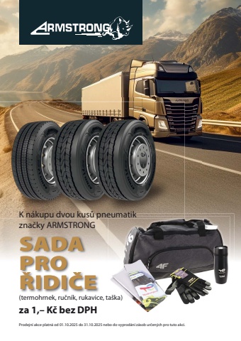 SADA PRO %u0158IDI%u010cEProdejn%u00ed akce platn%u00e1 od 01.10.2025 do 31.10.2025 nebo do vyprod%u00e1n%u00ed z%u00e1sob ur%u010den%u00fdch pro tuto akci.K%u00a0n%u00e1kupu dvou kus%u016f pneumatik zna%u010dky ARMSTRONGSADA PRO %u0158IDI%u010cE(termohrnek, ru%u010dn%u00edk, rukavice, ta%u0161ka)za 1,%u2013 K%u010d bez DPH